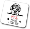 A simple and stylish “Woof” design for Cockapoo owners. A great addition to any coaster set.