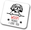 A simple and stylish “Woof” design for Shih Tzu owners. A great addition to any coaster set.